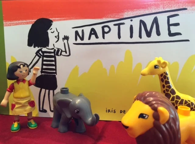 Very young children tell it like it is. So does Iris De Mouy in her enchanting book, NAPTIME. This author speaks kid. It's strong language gets better and better every page turn. The girl on the cover is beautifully rendered in black paint with bold brush strokes to create the colorful jungle setting. Wild animals appear on the page one at a time with their candid gripes. Zebra looks us in the eye saying, all in caps, "I DON'T WANT TO TAKE A NAP." Can two year olds relate to this text? You bet they can. And animals are in agreement as they support each other's statements. Crocodile tells us that naps are for little babies. Hippo, who occupies the other side of this double page spread simply adds, "TINY LITTLE BABIES." You get the picture. The author has created art that depicts animals that look sure of themselves. They know who they are. Elephant tells us, "I'M TOO BIG TO HAVE A NAP." It's hard to argue with that logic. Gorgeous splashes of color surround the jungle animals rendered in black paint. Hyena guffaws, saying, "HA, HA, HA. A NAP? WHAT A JOKE!" Brazen and hideous, hyena's washed over with yellow. But the little girl has to get these animals on the same page. After all, it IS nap time. She gives practical advice to the jungle beasts who have gathered together at the end of the book - on the same page, so to speak. One finger raised she tells them, "LISTEN TO ME!" They do listen to her and the reader watches as the animals do what she says. They are asleep by the last page, by the way, but you'll have to read the book to find out how she coaches rather than coaxes them to fall asleep. So if you have insomnia you might want to heed the advice in this book by Iris De Mouy. What a delightful book in every way! I do have a soft spot for irreverence in children's books. I'm also partial to those books that can be acted out over and over again. Most children will have everything they need to play nap time after enjoying this book. The child is in charge and it's time for the toys to nap. Gather some animals and see what they say about nap time. Borrow some lines from the book. Invent your own. Change the setting by taking out farm animals. Maybe pig claims he's too muddy to take a nap. What will rooster say about nap time? The possibilities launched by this exceptional children's book are endless. De Mouy lives in Paris. Her book lives in the hearts of the little people who are lucky enough to have big people pick this book. We have Groundwood Books to thank for the English translation and the second printing in 2015. It's high time you got your very own NAPTIME!